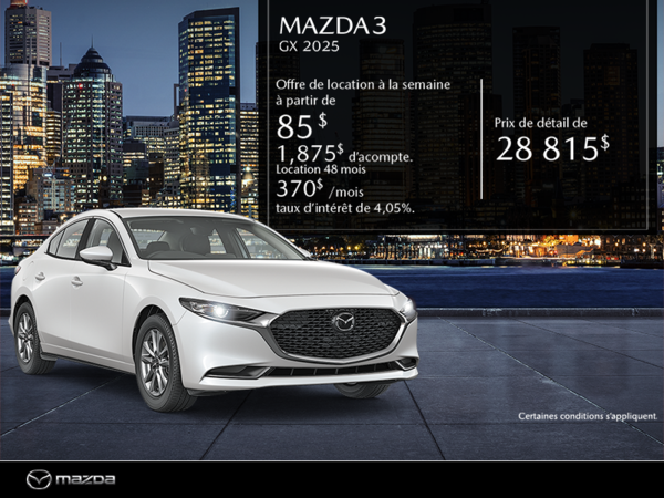 Nous vous offrons également plusieurs offres et promotions sur nos véhicules neufs et d’occasion Mazda en plus de vous proposer des offres de financement et de location avantageuses et abordables. Il est facile d’économiser à l’achat d’un véhicule neuf ou d’occasion certifié Mazda.
